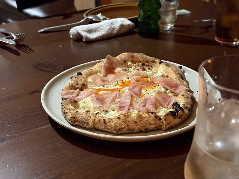 ピッツァ①生ハム、カリフラワー、半熟玉子